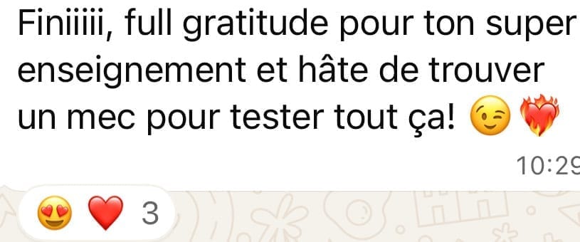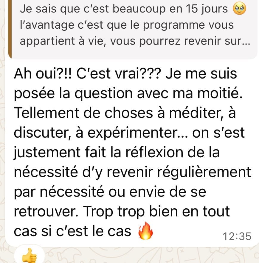 Oui, tout à fait. Le programme est conçu pour être suivi seule ou à deux : de nombreuses vidéos et exercices invitent à ouvrir le dialogue, à mieux comprendre le fonctionnement de chacun et à recréer du lien dans le couple.